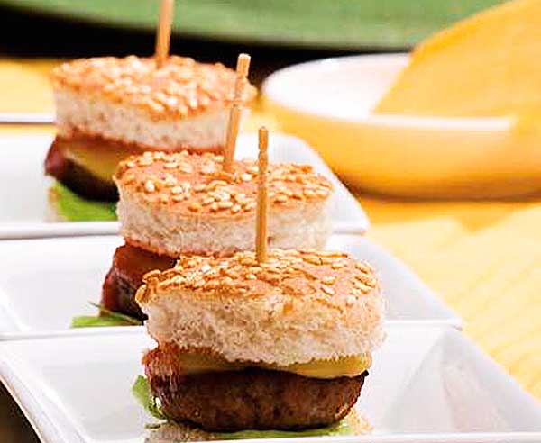 5. Colocar las hamburguesas sobre las mitades inferiores de los panes. Ponerles encima las hojas de lechuga, el pepinillo y el resto de la salsa de tomate. Presionar la parte superior del pan y clavar un palillo en medio. Servir caliente.