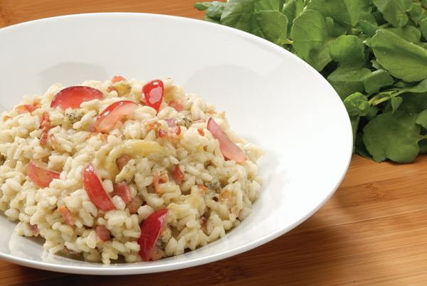 3. Cuando el arroz este casi cocido, añade el Queso Azul Paisa y revuelve bien. Por último, añade las uvas y deja algunas para decorar. Rectifica el sabor y si lo consideras necesario añádele sal. Recuerda que el Risotto no debe quedar seco