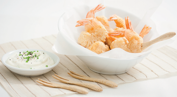 Al momento de servir, acompañar los camarones tempurizados con la crema agria.