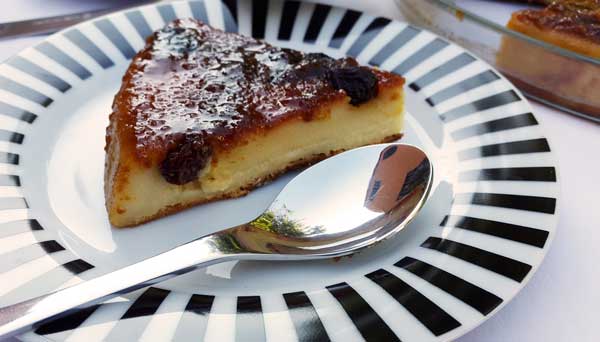 - Preparar en un molde de 23 cm de diámetro, un caramelo con las 2 cucharadas de azúcar y una de agua. Cuando esté color caramelo, esparcirlo por todo el fondo y los lados del molde y agregar las uvas pasas bien distribuidas por todo el molde.